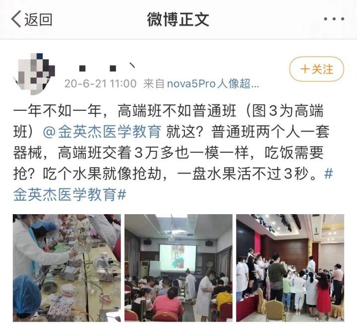和宣传不同的产品质量,也是用户踩坑的“重灾区”。有学员在微博吐槽,金英杰的高端班条件甚至不如普通班。“普通班两个人一套器械,3万元的高端班配置也一模一样”。