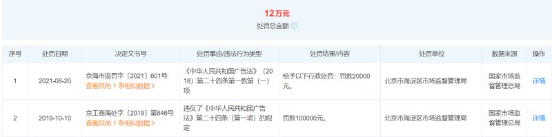 宣传方面,金英杰已经不是第一次越线。《广告法》第二十四条第一项规定,教育、培训广告不得含有对升学、通过考试、获得学位学历或者合格证书,或者对教育、培训的效果作出明示或者暗示的保证性承诺。天眼查显示,2019年和2021年,金英杰因违反这一条款,而被处以行政处罚共计12万元。