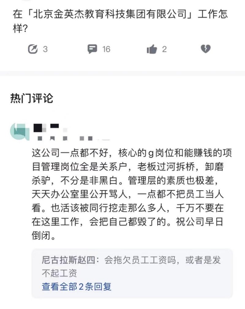 在脉脉上,有员工吐槽“入职三年,从未准时发过工资,少则几天,多则两三个月”“工资常年拖欠,2021-2022年都是拖欠3个月”“老师课酬拖拖拉拉,员工工资也欠着不发。”金英杰的课程和服务多次被吐槽,或许能从这找到部分原因。