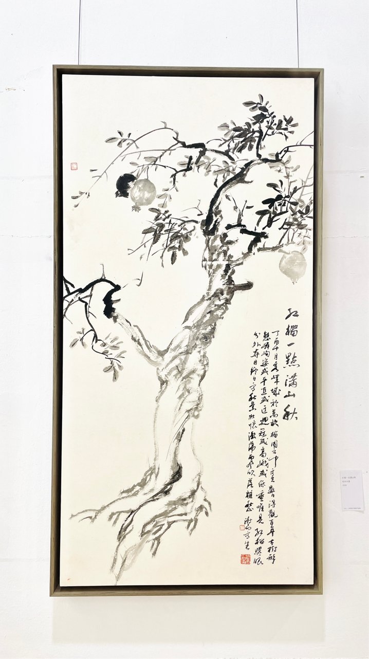 这幅作品让我想起黄宾虹先生的“起、承、转、合”,画面“起”的部分从左下角石榴树的根部,接着往上看石榴树的枝干是“承”的部分,画面最精彩的部分是石榴叶子和石榴的果实,正好也可以作为“转”的部分,最后提字落款作为“合”。构图可谓十分精妙绝伦!