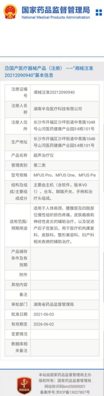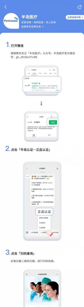 作为目前市场上唯一获得NMPA认证的超声仪器,半岛医疗科技公司研发的半岛超声炮,要在授权认证的专业医疗机构由持证医师亲自操作才可以合法合规使用,根据医美查验真攻略了解到,需关注“半岛医疗”公众号进行四重验真。