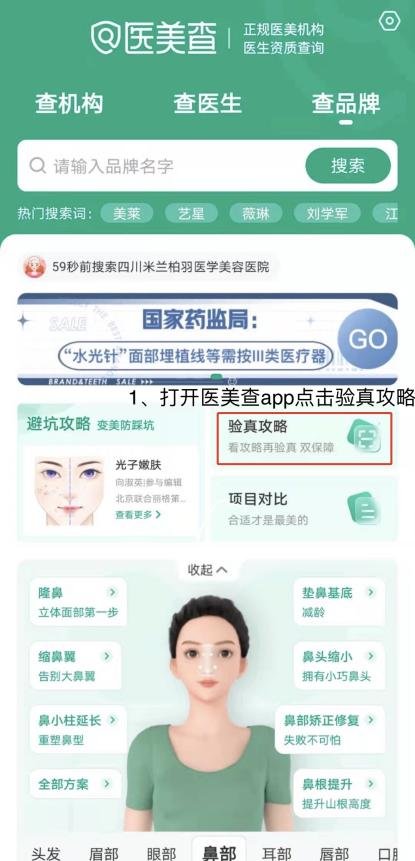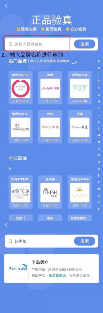 市面上的超声炮设备良莠不齐,消费者很难辨别,为保障求美者治疗过程中的效果与安全,消费者可以在医美查app上搜索品牌名称查询验真方法。