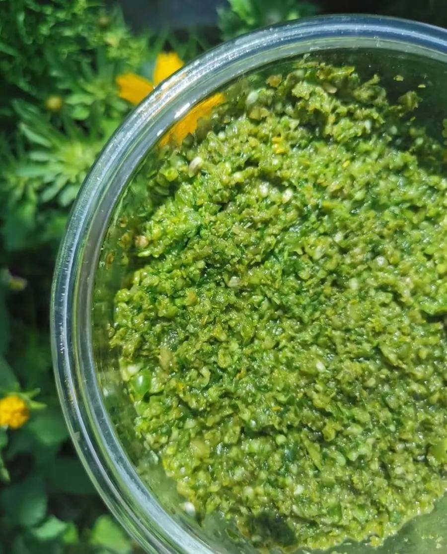 半开的韭花洗净后,和辣椒或者香椿叶子一起捣碎成泥,再用勺子挖出放进陶罐里,加盐密封。