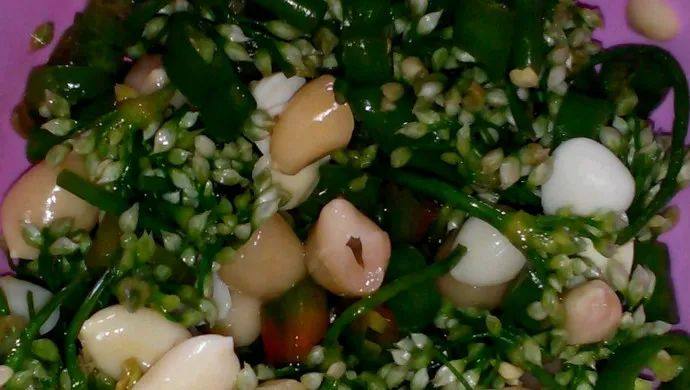 在同事的家乡商丘,韭菜花有另一种吃法,韭菜花腌杏仁。