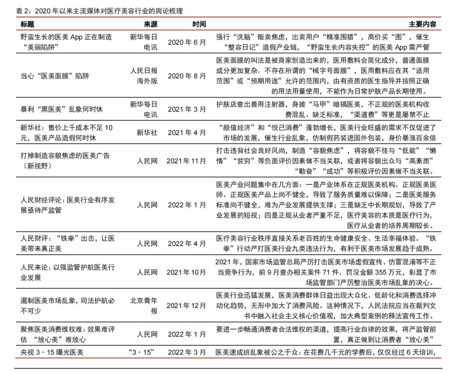 2022 年医美行业进入合规发展时代监管力度升级,针对医美产品、机构、营销宣传渠道等全方位整顿2020 年以来针对医美行业监管整体加强,2021 年 8 月开始,监管力度升级,针对医美产品、机构、营销宣传渠道等各环节实行了全方位整顿,对行业开始形成实质性较大影响,2022 年医美行业迈入合规发展时代。