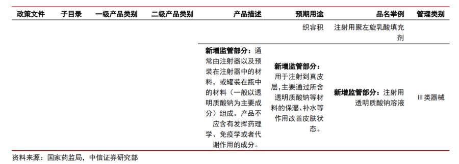 在《医疗器械分类目录》部分内容调整表中,国家药监局对部分医美产品监管类别进行了调整,将保湿、补水作为预期用途的注射整形美容产品也纳入进Ⅲ类医疗器械进行监管,而在药监局 2017 年《医疗器械分类目录》中只有预期用途为增加组织容积才按照Ⅲ类医疗器械进行监管。