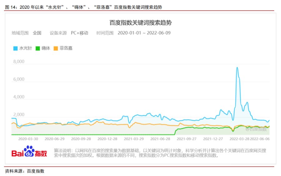 2022 年 3 月,国家药监局发布关于调整《医疗器械分类目录》部分内容的公告,确定将水光针纳入械三分类、监管加强,菲洛嘉市场关注度有所下降,嗨体市场关注度大幅提升。