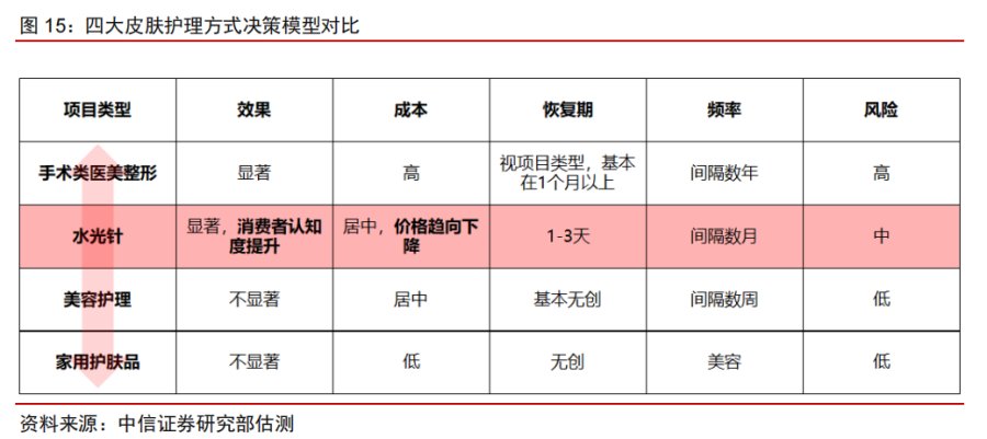 消费者会综合考虑该四类皮肤护理方式的效果、成本、恢复期、使用频率以及风险。水光针属于效果显著的护肤方式,且随着消费者认知度提升,水光针受到有望更大消费群体的认可,且其成本居中、价格趋势向下,价格区间内受众越来越广,恢复期较短、使用频率相对较低。美容护理、家用护肤品等品类体现皮肤护理市场需求旺盛,水光针具有潜在渗透空间。