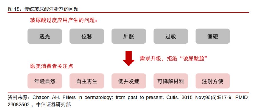对比传统玻尿酸注射,再生医美具有效果好、更长效、抗衰老等优势,有望代替部分高端玻尿酸市场引领医美消费需求升级。在医美市场整体高速扩张之下,医美市场内部的需求升级和产品迭代也已暗流涌动。