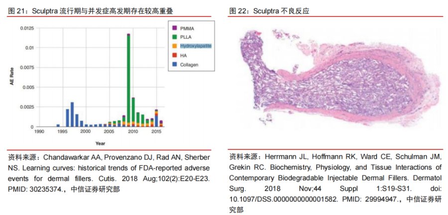 此外,以 Sculptra 为代表的传统 PLLA产品还存在一些不良反应,其中大多数不良反应为出现微小可触性结节,研究显示此类不良反应与不良的产品结构或产品注射部位以及稀释程度有关。还有研究显示传统 PLLA 产品的流行期与医美并发症高发期存在较高重叠,或侧面反映传统 PLLA 产品存在一定风险性。