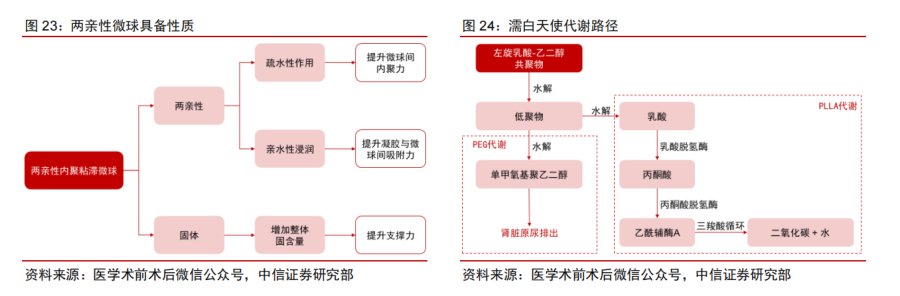 爱美客首次将金标准微球粒径制备技术应用于 PLLA,胶原再生效率高,避免过强炎性反应,阻断过分再生诱因。濡白天使使用了双亲性内聚粘滞微球,组织融合性更高。