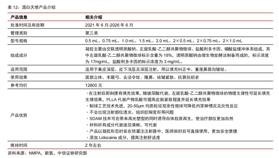 濡白天使是爱美客旗下含左旋乳酸-乙二醇共聚物(PLLA)微球的交联透明质酸钠凝胶,产品于 2021 年 6 月获 NMPA 批准,有效期至 2026 年 6 月,属于第三类医疗器械,适用于真皮深层、皮下浅层及深层注射,用以填充纠正中、重度鼻唇沟皱纹。与竞品相比,濡白天使在产品力、医生操作便捷度及用户体验方面具备竞争优势。