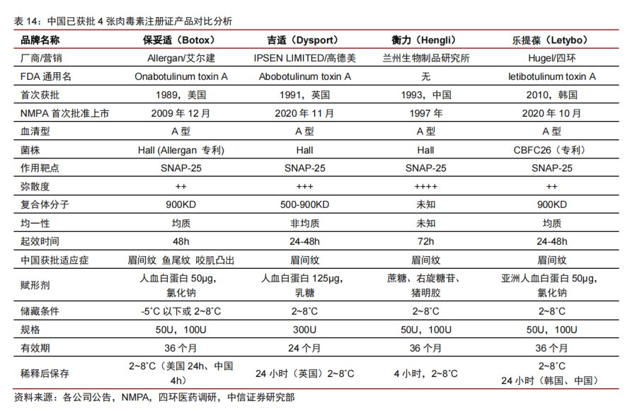 目前国内已获批的四家肉毒素产品,血清均为 A 型、作用靶点均为 SNAP-25。截至2021 年 4 月,我国已申批上市的有 4 家肉毒素品牌:Allergan 旗下 Botox、兰州生物所的衡力、英国 Ipsen 旗下的吉适 Dysport、四环医药并购的韩国 Hugel 的乐提葆 Letybo。吉适和衡力采用的艾尔健的 Hall 专利菌株,乐提葆为自有专利菌株 CBFC26;四家产品在弥散度(决定了治疗的精准度、是否自然等)、复合体分子(与起效时间相关)、均一性、稳定性(决定自然度、持续时间等)、赋形剂(与安全性、过敏与否等相关)等方面各有不同。