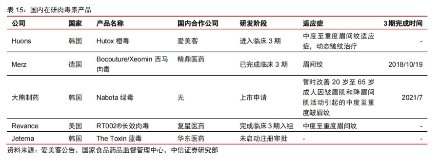 国内 5 款肉毒处于申请阶段。包括:Huons 的 Hutox 橙毒、Merz 的西马肉毒、大熊制药的 Nabota 绿毒、Revance 的 RT002®长效肉毒和 Jetema The Toxin 蓝毒。大熊制药的 Nabota 绿毒进度最快已提交上市申请,有望成为国内获得第五张注册证的肉毒素产品。此外,爱美客经韩国 Huons Co., Ltd.独家授权在中国注册及商业化注射用 A 型肉毒毒素在研产品的独家权利,为期十年。目前,爱美客注射用 A 型肉毒毒素在针对中度至重度眉间纹适应症方面免于在中国进行 I 期及 II 期临床试验,因此处于临床 3 期,较落后于 Merz 的西马肉毒和 Revance 的 RT002®长效肉毒。Jetema 的 The Toxin 蓝毒进度最慢,与华东医药签署战略合作,尚未启动注册审批。