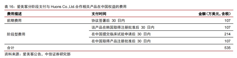 爱美客参股韩国 Huons BioPharma Co.,Ltd 股权,强化肉毒素战略布局,拓展未来市场空间。2018 年 9 月,爱美客与韩国 Huons Co.,Ltd.(控股公司为 Huons Global)签 订 A 型肉毒毒素产品在中国的合作协议。Huons Co.,Ltd.授权爱美客在中国区域内进口、注册和经销其生产的 A 型肉毒毒素产品 100U(900KDa),爱美客将负责该产品在中国区域内的临床试验及注册申请。注册成功后,爱美客将获得在中国境内的该产品 10 年独家经销权。根据双方签订的《经销协议》和《经销协议修正案》,爱美客取得相关产品在中国权益的费用合计 535 万美元,分阶段支付。2021 年 7 月,爱美客使用超募资金约 8.86亿元对 Huons BioPharma Co.,Ltd(控股公司为 Huons Global,主营肉毒素产品 Hutox)进行增资并收购部分股权。其中,约 5.81 亿元增资认购 Huons BioPharma Co.,Ltd 80 万股股份,约 3.05 亿元收购 Huons Global 持有 Huons BioPharma Co.,Ltd 8.8%的股权计42 万股股份。经过增资,爱美客合计持有 Huons BioPharma Co.,Ltd 122 万股股份,持股比例 25.4%,进一步强化肉毒素产品的战略布局。