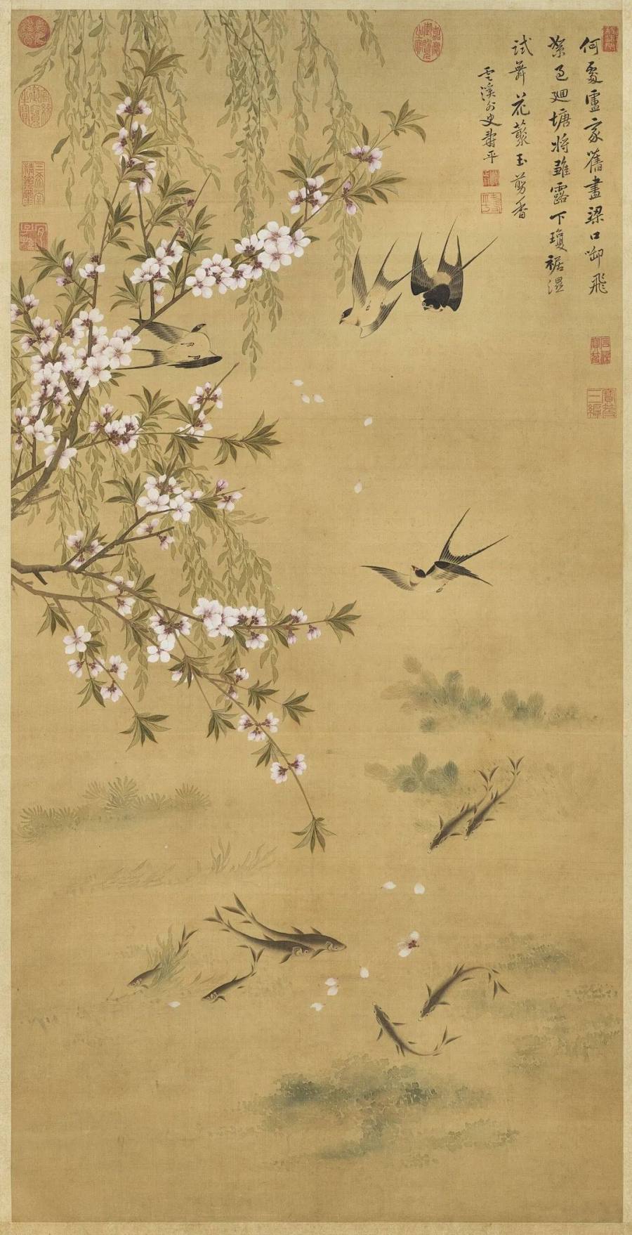 桃红柳绿,落英缤纷,燕子穿梭其间,游鱼逐花瓣,一片明媚春光。《燕喜鱼乐轴》以没骨法绘成,直接用色点染,再略加勾画叶脉筋络。全幅设色典雅,有脱俗的气质。