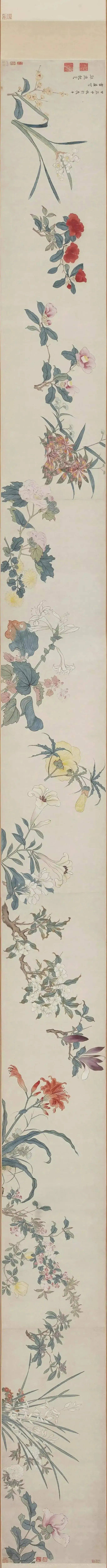 《二十四番花图卷》绘自小寒至谷雨,一百二十日,八个节气中的代表花卉,自牡丹始至梅花结束,花儿繁多,自然清雅!