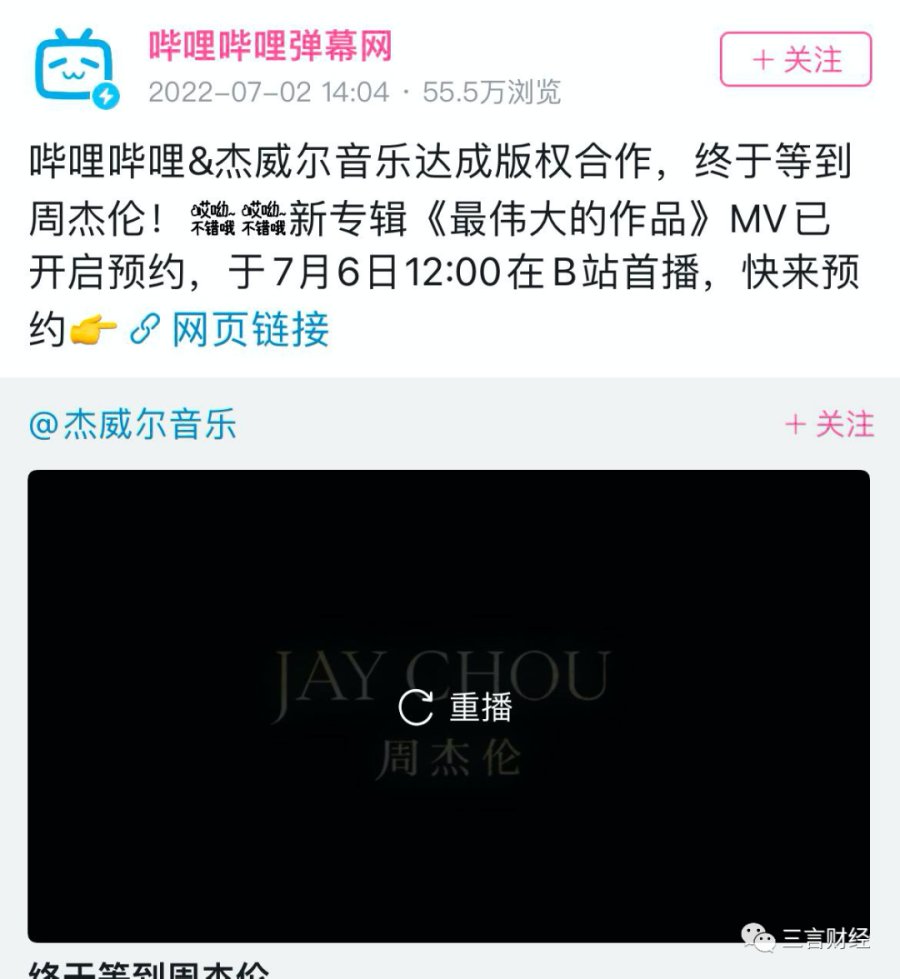 7月2日,哔哩哔哩宣布与杰威尔音乐达成版权合作,周杰伦新专辑《最伟大的作品》MV已开启预约,于7月6日12:00在B站首播。