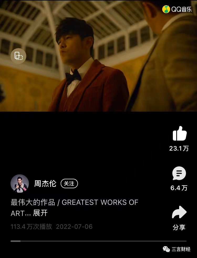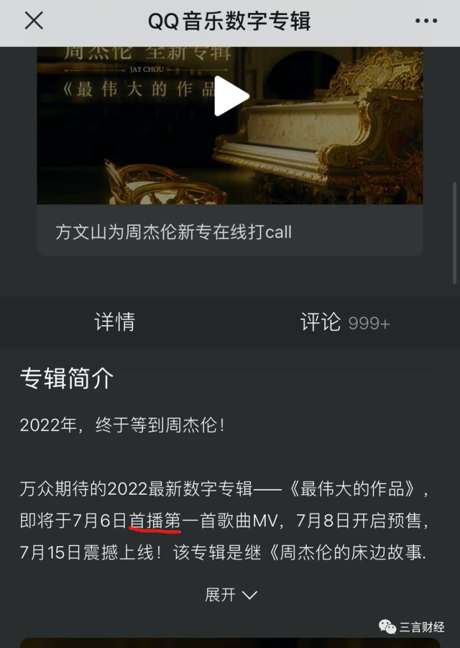 QQ音乐则显示,周杰伦2022最新数字专辑——《最伟大的作品》将于7月6日首播第一首歌曲MV,7月8日开启预售,7月15日上线。
