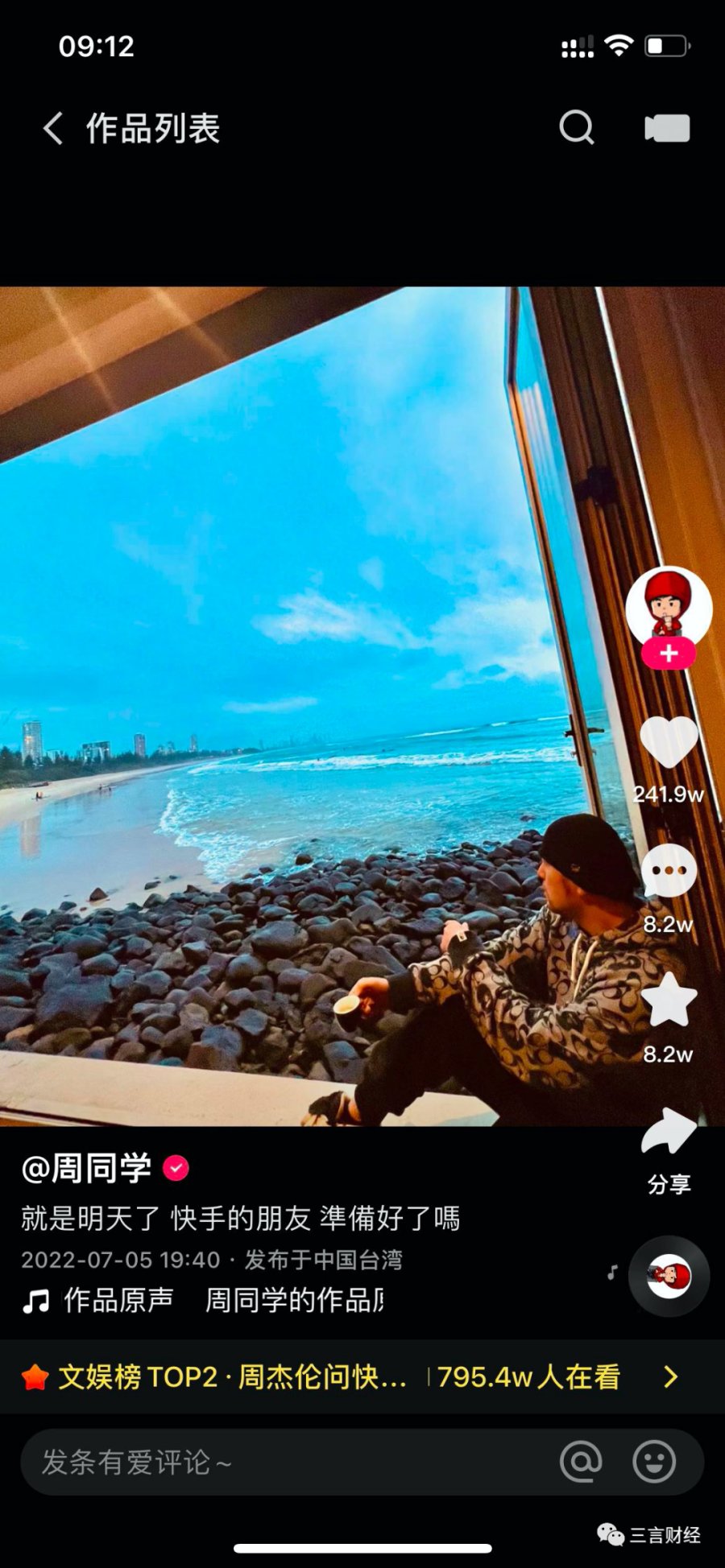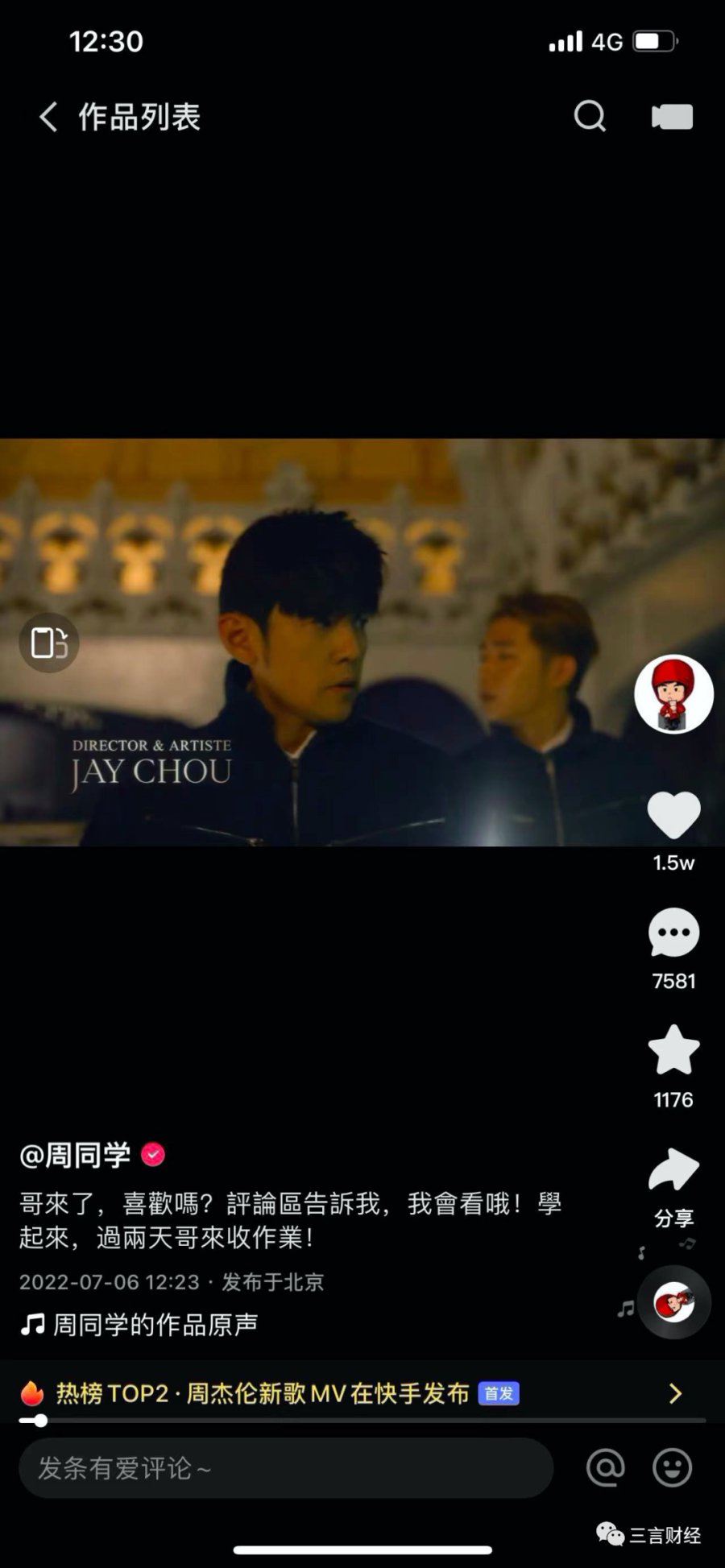 而周杰伦本人的快手号,12:23才发布。7分钟收获1.5万点赞,7581评论,1176收藏。