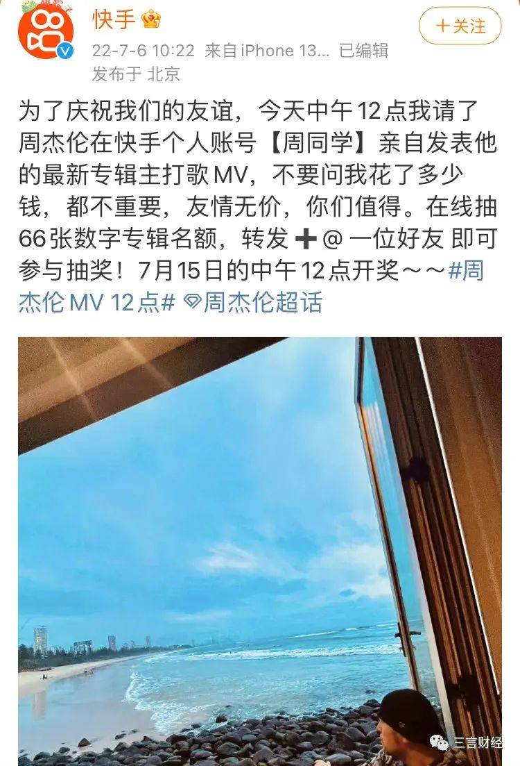 就在今天上午,快手官方微博再次发文:“为了庆祝我们的友谊,今天中午12点我请了周杰伦在快手个人账号【周同学】亲自发表他的最新专辑主打歌MV,不要问我花了多少钱,都不重要,友情无价,你们值得。”
