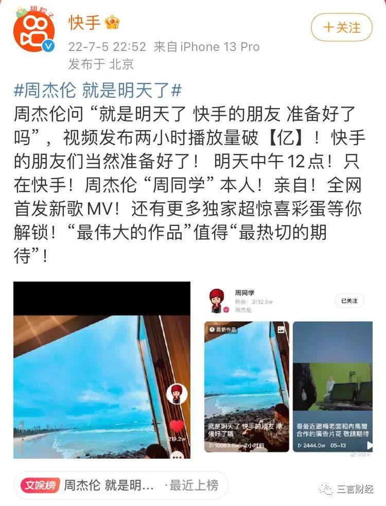 同日,快手官方微博发文称,周杰伦问“就是明天了 快手的朋友 准备好了吗”,视频发布两小时播放量破亿,明天中午12点 ,只在快手,周杰伦本人亲自全网首发新歌MV。