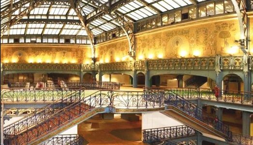 四周的黄色壁画,是从19世纪末新艺术运动热潮时,莎玛丽丹的新艺术风格装修遗留至今的。这些壁画其实是孔雀和鲜花的瓷面石板。
