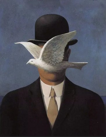 鸽子与青苹果有着异曲同工之妙,不知大家有没有注意到,用偶然事物来遮挡面孔,是马格利特超现实肖像画的一个典型特色。
