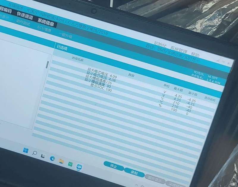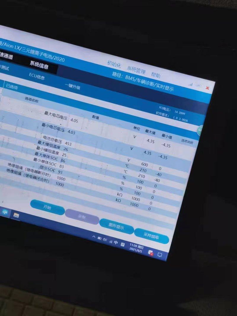 连接诊断电脑后,车辆表显电量100%,在表显SOC 100%的情况下,诊断电脑显示电池剩余电量SOC 100%,电池健康度SOH 100%,最大单体电压4.09V,与811电芯最大单体电压典型标定值4.19V相差0.1V。