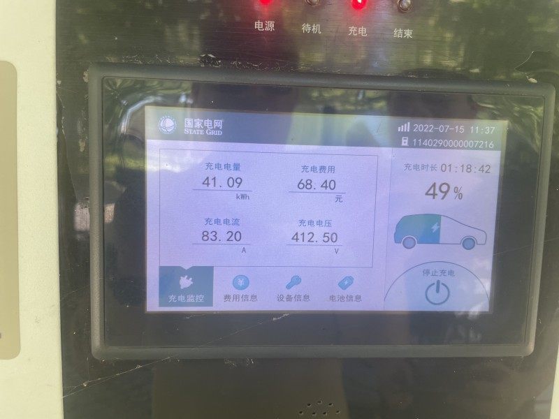 根据充电的过程来看,10点18分车辆接入国家电网2015 60kW DC充电桩,充电桩显示剩余电量1%;10点35分,剩余电量充至10%,电流达到峰值83.2A,随后充电电流一直稳定在83.2A,电池温控系统启动工作,现场可听到明显的散热声。11点37分,剩余电量充至49%,而用时却有1小时18分之多。