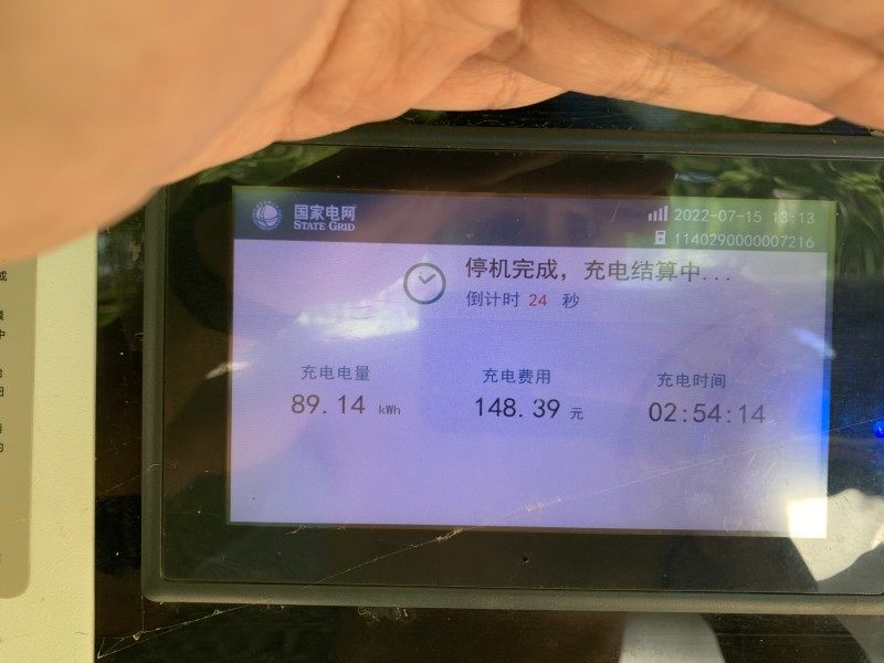 13点13分,经过2小时54分钟的等待后,电池充满,充电自动结束。根据充电桩结算信息显示,本次实验充电电量为89.14度,用时长达近3小时。