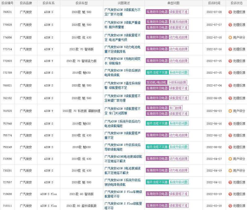 2021年纯电动投诉排行榜上,广汽埃安的主力车型AION S,位居第五名。其中投诉比较集中的问题就是系统升级问题和续航里程缩水等,很多车主所反映的疑似“锁电”。而根据车质网显示,近期关于广汽埃安AION S的投诉,也不在少数。