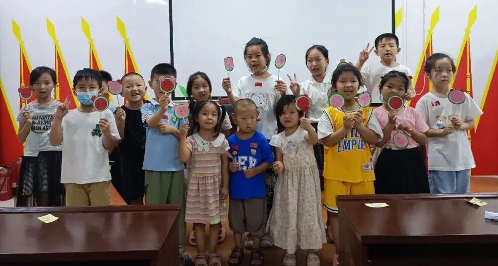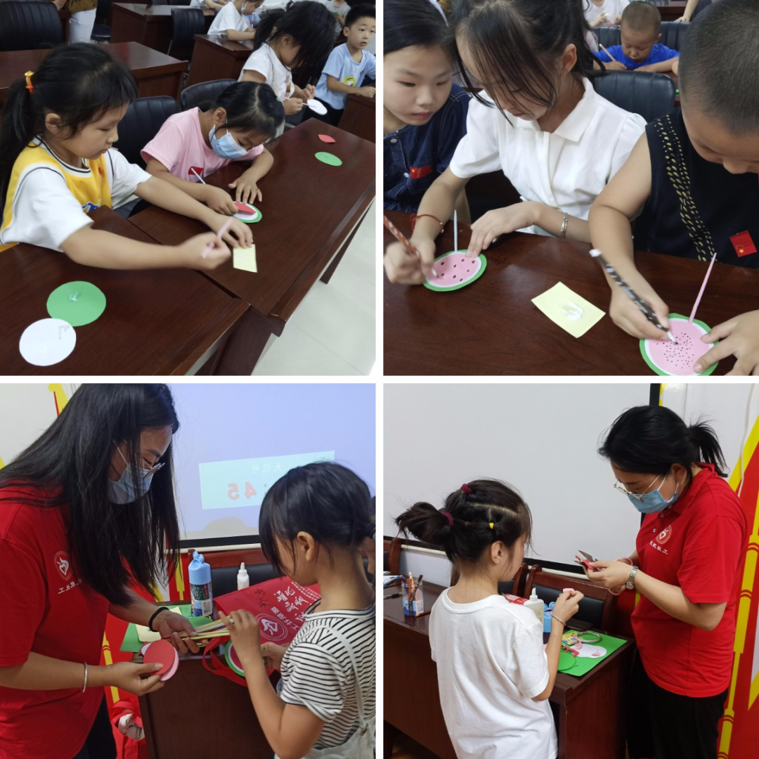 随后,社工老师带领孩子们开始手工西瓜扇的制作,首先给孩子们讲解西瓜扇的制作方法、色彩搭配等知识,接下来就是孩子们自由发挥的时候了,活动现场气氛活跃,大家时不时地就制作中遇到的具体问题向老师请教、互相交流。学生们根据自己的喜好,精心搭配,制作自己专属的西瓜扇,孩子们抑制不住喜悦之情,迫不及待地展示自己的作品。