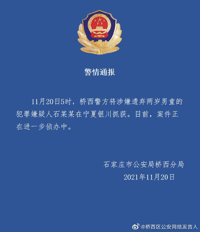 石家庄2岁男童被遗弃,其父20日在宁夏银川被抓获