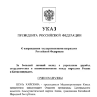 总统令中称,为表彰慎海雄对巩固俄中人民友谊、合作,增进互相之间的了解做出的巨大贡献,特授予友谊勋章。