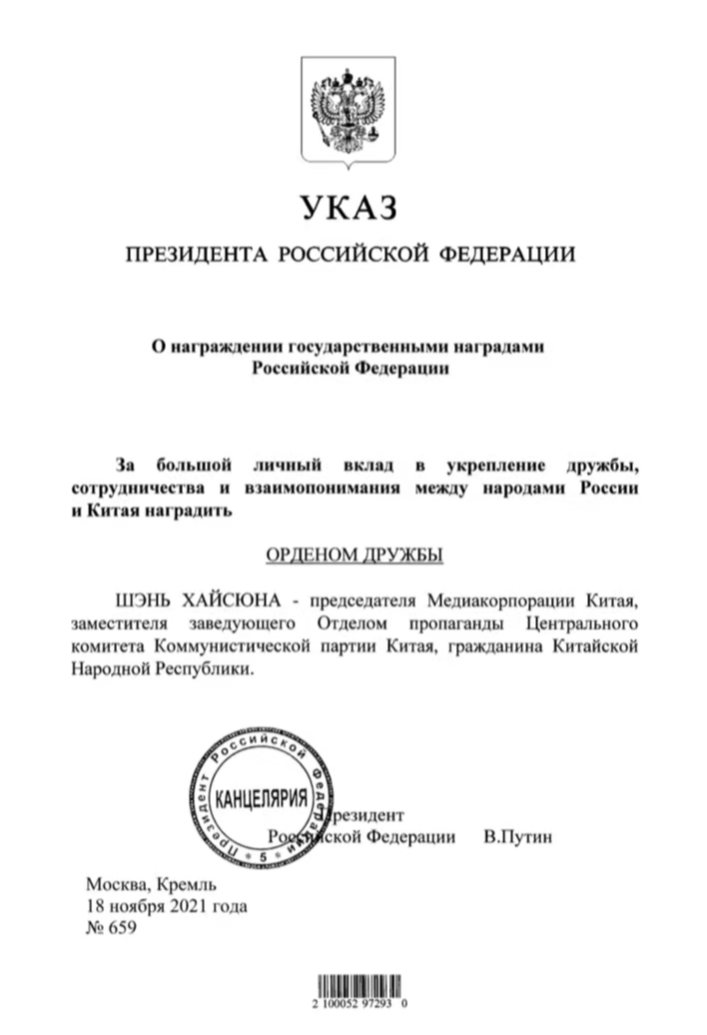 莫斯科当地时间11月18日,俄罗斯政府法律信息门户网站发布俄罗斯总统普京签署的总统令,授予中国中央广播电视总台台长慎海雄“友谊勋章”。