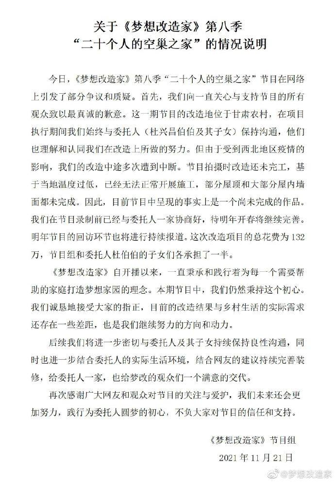 今日,《梦想改造家》第八季“二十个人的空巢之家”节目在网络上引发了部分争议和质疑。首先,我们向一直关心与支持节目的所有观众致以最真诚的歉意。这一期节目的改造地位于甘肃农村,在项目执行期间我们始终与委托人(杜兴昌伯伯及其子女)保持沟通,他们也理解和认同我们在改造上所做的努力。但由于受到西北地区疫情的影响,我们的改造中途多次遭到中断。节目拍摄时改造还未完工,基于当地温度过低,已经无法正常开展施工,部分屋顶和大部分屋内墙面都未完成。因此,目前节目中呈现的事实上是一个尚未完成的作品。我们在节目录制前已经与委托人一家协商好,待明年开春将继续完善。明年节目的回访环节也将进行持续报道。这次改造项目的总花费为132万,节目组和委托人杜伯伯的子女们各承担了一半。