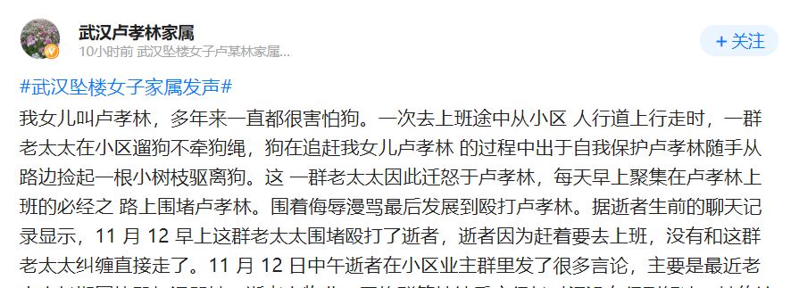 21日晚,认证为“武汉卢孝林家属”的账号在平台发文,称女儿在被狗追赶的过程中,出于自我保护从路边捡起一根小树枝驱离狗,遛狗不牵狗绳的老太太们因此迁怒于卢孝林,每早聚集在她上班的必经之路上围堵,侮辱漫骂最后发展到殴打。