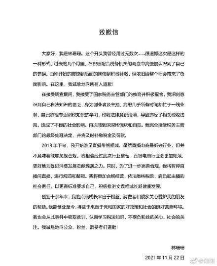 随后,林珊珊也发布致歉信,表示将更加合规经营,依法缴纳税款。