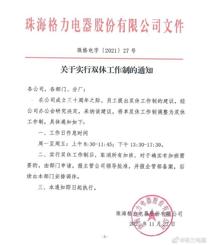 11月22日,@格力电器官方微博发布通知,将单双休工作制调整为双休工作制。实行双休工作制后,取消所有加班,对于确实有加班需要的,由部门申请,报主管公司领导批准,并报企管部门备案,后续由本部门安排调休。