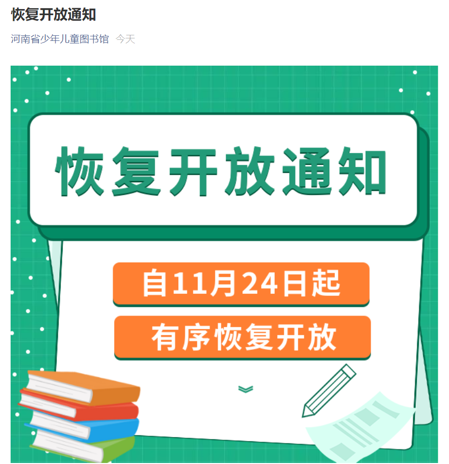 记者了解到,河南省少儿图书馆自11月24日起有序恢复开放。开放后采取线上预约措施,在馆人数达到1000人后,采取出一进一方式。