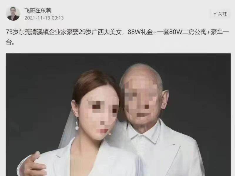 近日,一位名为“飞哥在东莞”的网友,在网络平台上配图发文称:“73岁东莞清溪企业家豪娶29岁广西大美女,88万礼金+88万二房公寓+豪车一辆。”这则信息在网络平台迅速传播,引发大量关注。