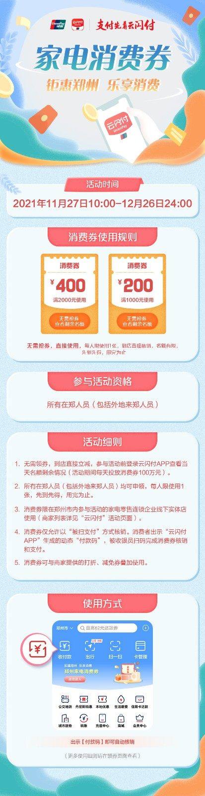 本次活动从11月27日10:00起,至12月26日24:00。家电消费券以电子消费券形式发放,所有在郑人员(包括外地来郑人员)通过银联“云闪付APP”活动页面均可参与活动。共计发放3000万元,分为200元券、400元券两种,总计12.5万张。其中,200元券10万张,400元券2.5万张。本次活动期间,家电消费券每天投放额度100万元,当天未核销的自动计入到次日,可继续使用。活动期满仍未使用的,予以回收。