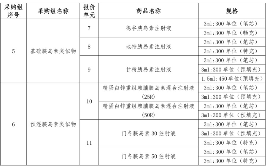 根据上述文件,此次胰岛素集采品种包括餐时人胰岛素、基础人胰岛素、预混人胰岛素、餐时胰岛素类似物、基础胰岛素类似物、预混胰岛素类似物,共6个采购组。各采购组符合申报资格的企业按报价单元进行申报,报价单元共11个。