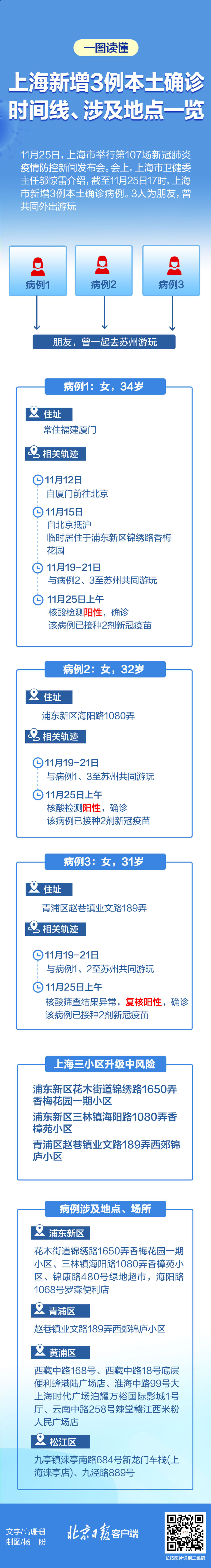 据江苏苏州疫情防控指挥部消息,11月25日,上海市新增3例新冠肺炎本土确诊病例,这3例确诊病例为朋友关系,在11月19日至21日曾先后至苏州共同游玩,有较长时间密切接触史,有明确流行病学关联。