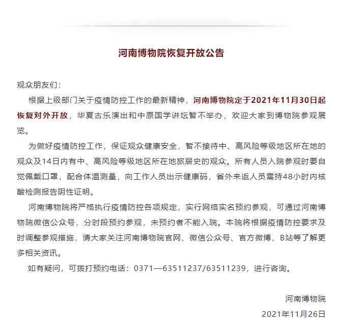 11月26日,记者从河南博物院获悉,在做好疫情防控的前提下,河南博物院将于11月30日(下周二)重新恢复对外开放,华夏古乐演出和中原国学讲坛暂不举办。为保证观众健康安全,暂不接待中、高风险等级地区所在地的观众及14日内有中、高风险等级地区所在地旅居史的观众。所有人员入院参观时要自觉佩戴口罩,配合体温测量,向工作人员出示健康码,省外来返人员需持48小时内核酸检测报告阴性证明。