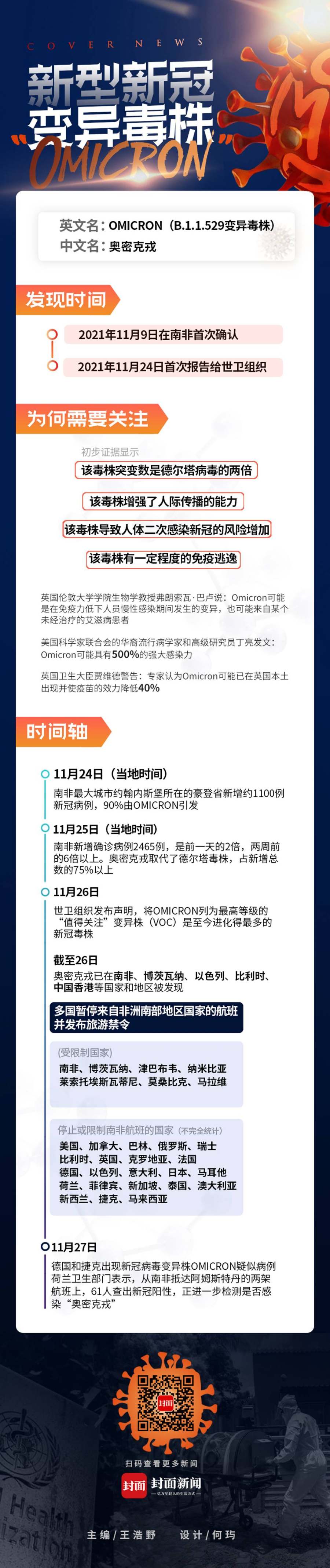 根据世卫组织26日下午发布的通报:这个被称为B.1.1.529的变异株已被该组织定性为最高级别的“值得关切的变异株”(VOC),并命名为Omicron(奥密克戎 )。而这距离该变异株被发现仅过去了两天时间。