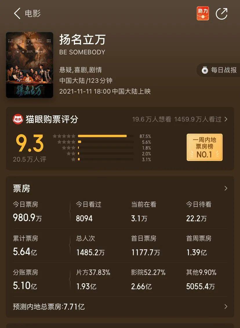 上映18天,票房超5.6亿元,小成本电影《扬名立万》成为11月的票房黑马。
