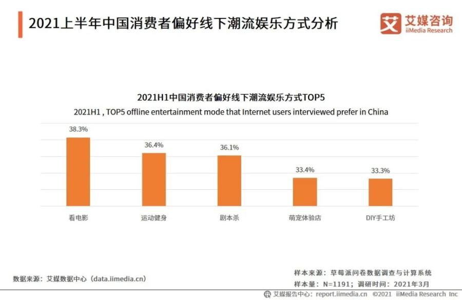 剧本杀正从一项小众娱乐进化为大众娱乐。公开数据显示,2021年上半年中国消费者偏好的线下潮流娱乐方式中,剧本杀位列第三名,前两名分别是电影和运动健身,且从比例来看,差距不大。艾媒咨询发布的《2021年剧本杀行业报告》显示,2021年剧本杀预计规模将达到170亿元,同比增长率将上升到45%,相比疫情爆发的2020年增长率得到大幅提升。