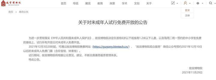 2021年12月3日20时起,可通过故宫博物院售票网站(https://gugong.ktmtech.cn/)、“故宫博物院观众服务”微信公众号预约2021年12月10日以后的未成年人免费门票(含珍宝馆、钟表馆)。